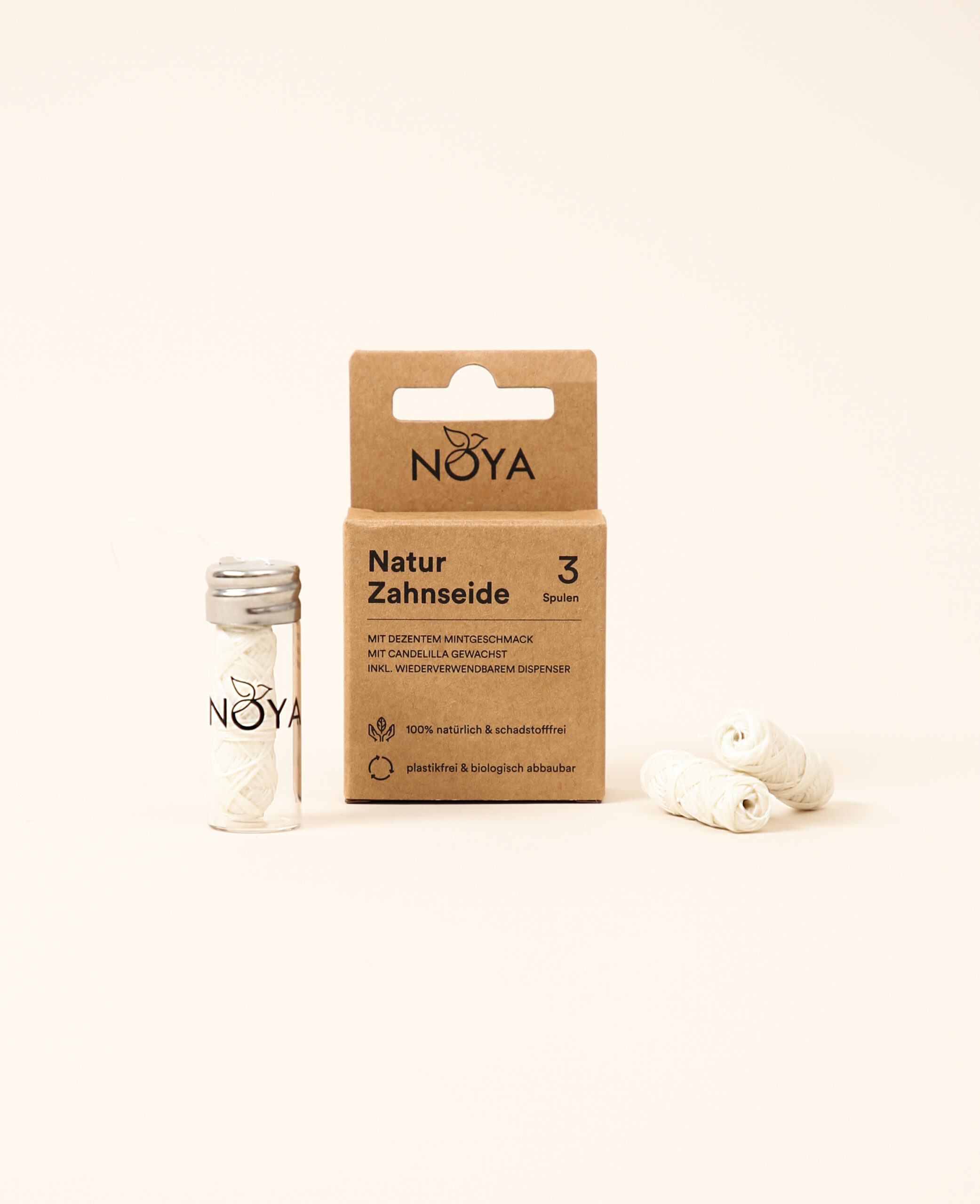 Die Noya Naturzahnseide kommt in einem wiederverwendbaren Glasdispenser, was sie zur perfekten plastikfreien Alternative macht. Jede Verpackung enthält 3 Rollen à 30 Meter. Die Zahnseide hat einen dezenten Mintgeschmack, der von natürlichem ätherischem Minzöl stammt. Ein kleiner Schritt für dich, ein grosser für die Umwelt.