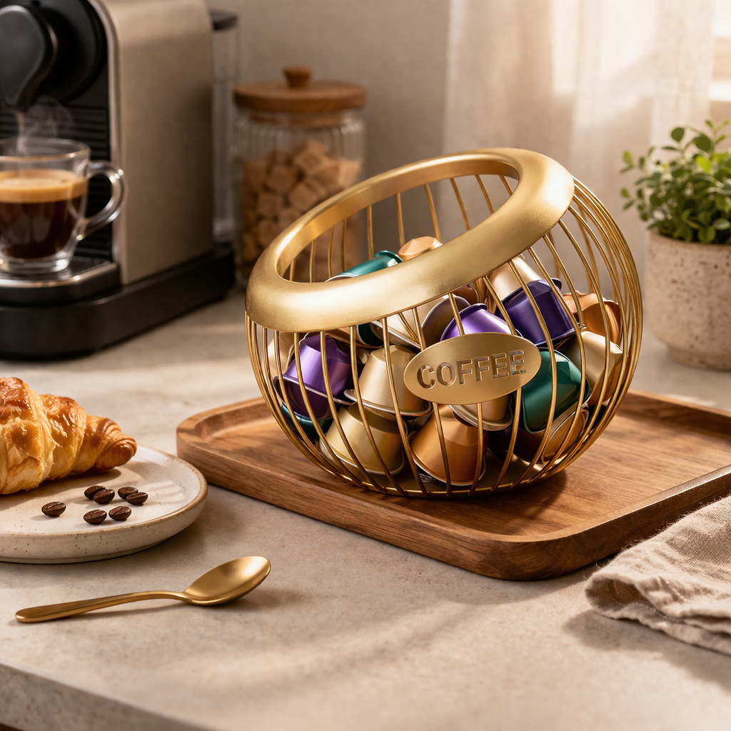 Mit dieser eleganten Schale bringst du Ordnung und Stil in deine Kaffee-Ecke. Der praktische Aufbewahrungs Korb bietet dir ausreichend Platz für deine Kaffee Kapseln und sorgt dafür, dass du sie jederzeit schnell griffbereit hast. Ideal für den Einsatz in der Küche oder neben deiner Kaffeemaschine.