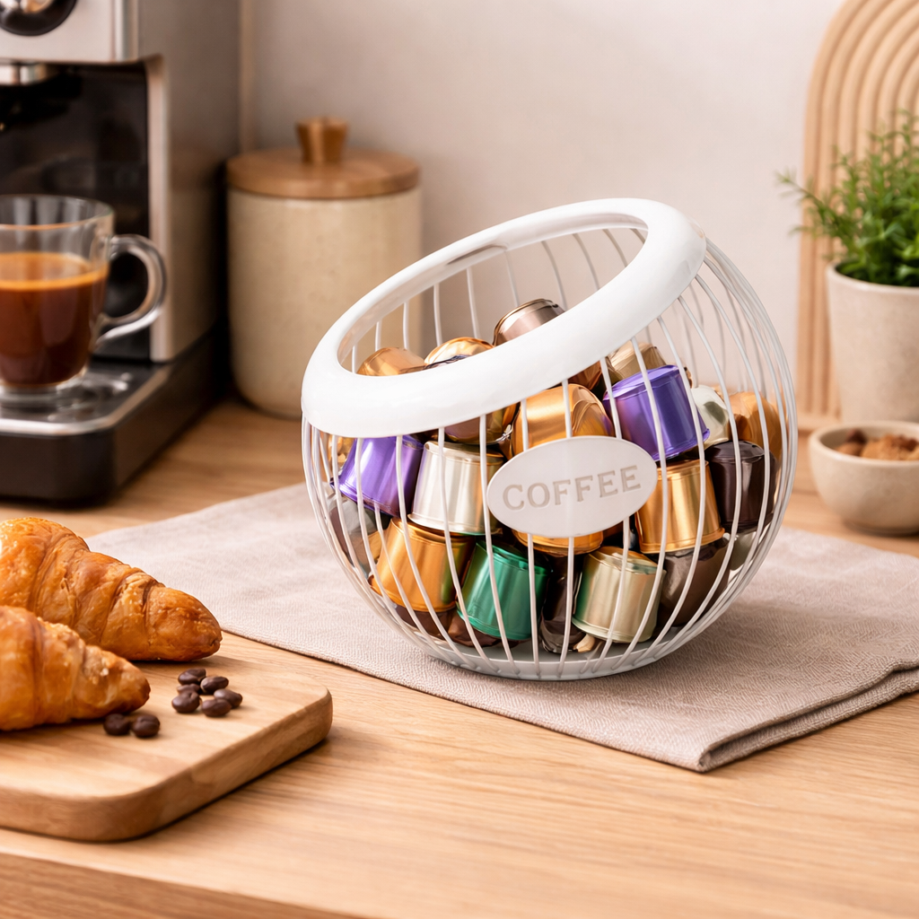 Gefertigt aus stabilem Metall, überzeugt der Korb durch seine langlebige und alltagstaugliche Verarbeitung. Die offene Struktur sorgt für eine übersichtliche Aufbewahrung deiner Kaffee Kapseln und erleichtert dir den Zugriff im Alltag.