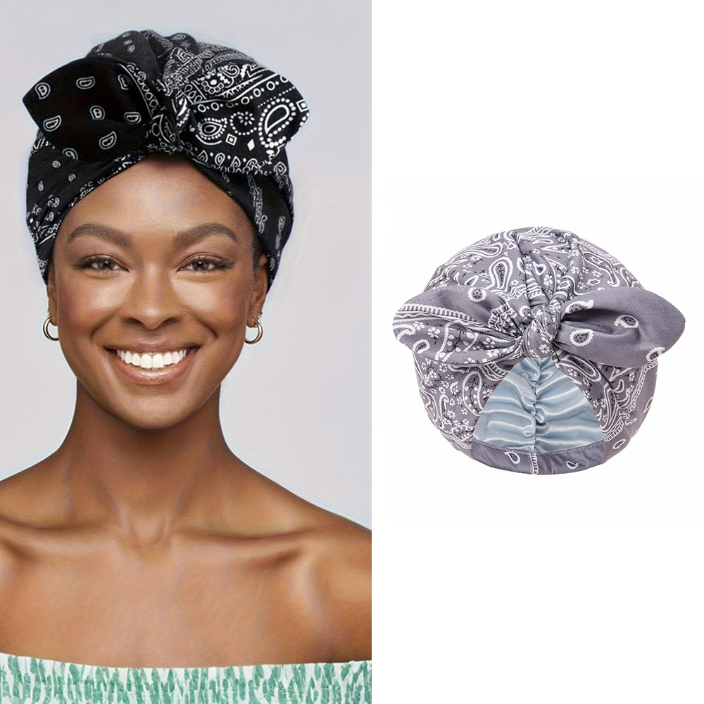 (Ø29cm) Elastische Nachtmütze Haar Schlafmütze Schleifen Bonnet mit Satin Innenfutter Paisley Muster - Grau / Weiss