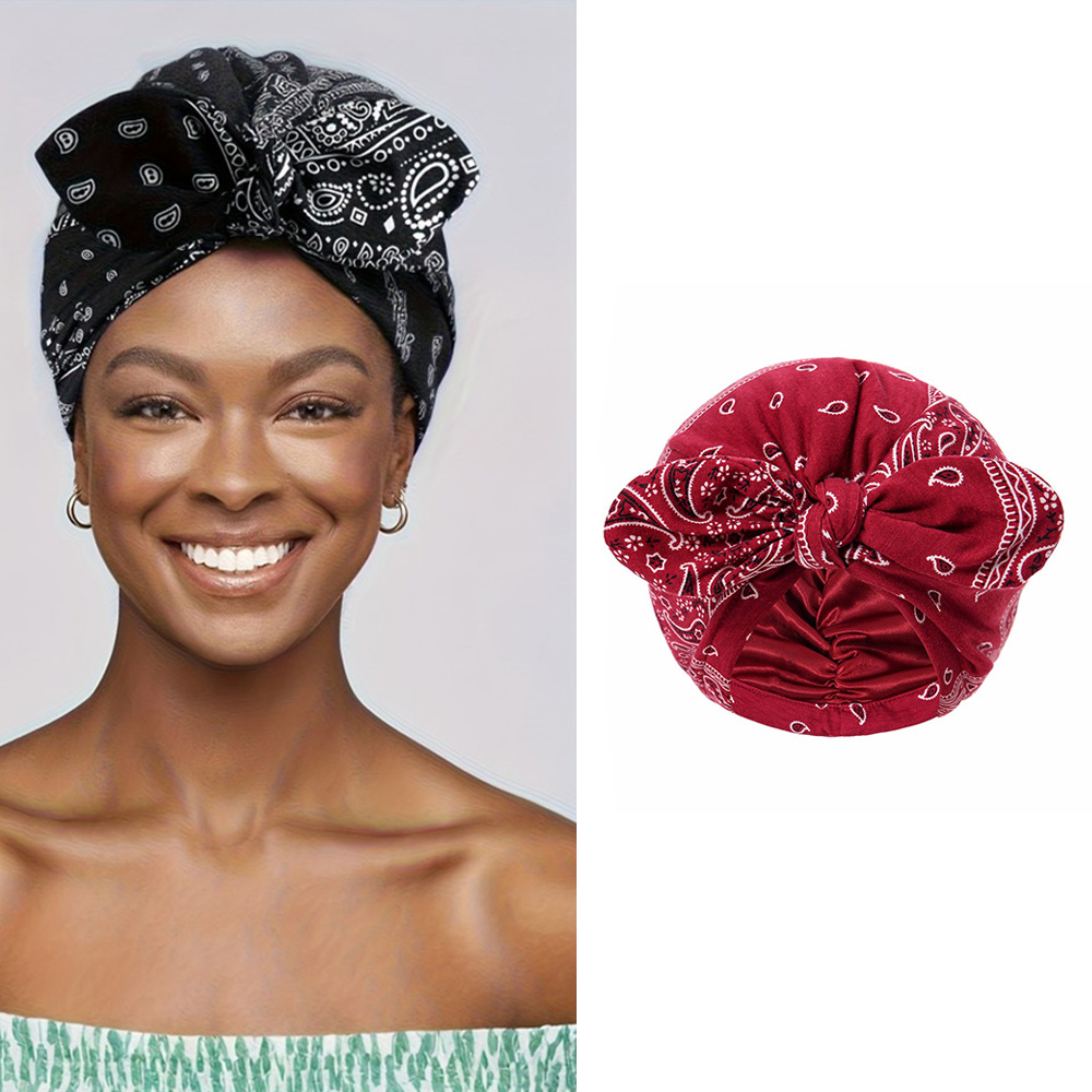 (Ø29cm) Elastische Nachtmütze Haar Schlafmütze Schleifen Bonnet mit Satin Innenfutter Paisley Muster - Rot / Weiss