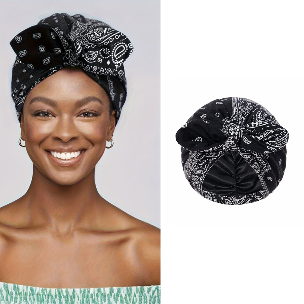 (Ø29cm) Elastische Nachtmütze Haar Schlafmütze Schleifen Bonnet mit Satin Innenfutter Paisley Muster - Schwarz / Weiss