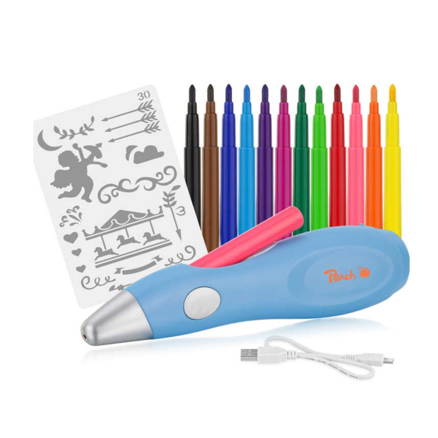 - 12 farbenfrohe Marker + 5 Schablonen mit Motiven