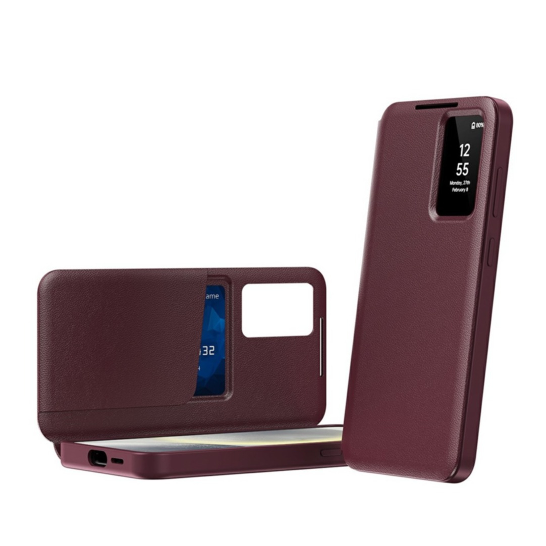Samsung Galaxy S26 Ultra Leder Hülle Small Window View Flip Case Litchi Look - Dunkelrot