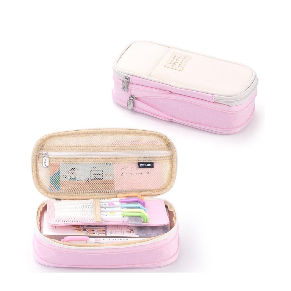 Schreibgeräte Organizer Schlamperbox Stift Etui mit Netztaschen + Erweiterung - Beige / Rosa