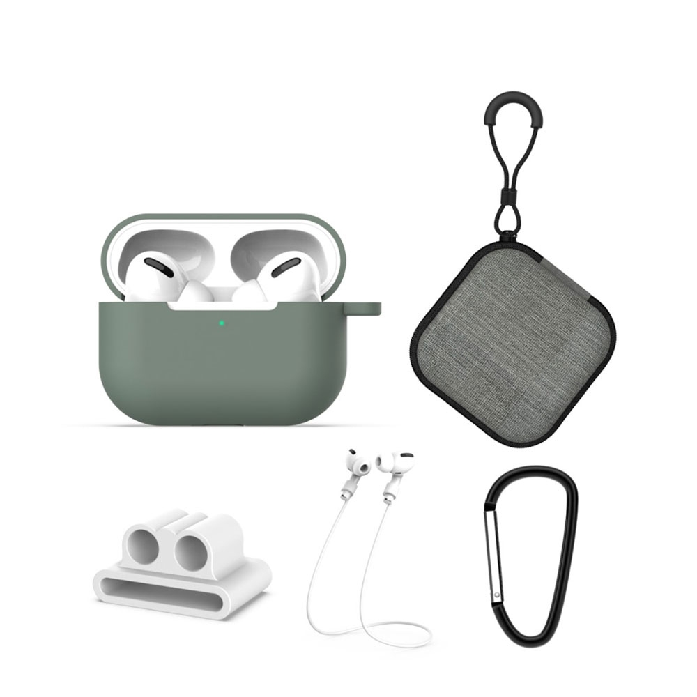 5in1 AirPods Pro Silikon Schutzhülle + Watch Halterung + Karabinerhaken + Straps + Tasche - Olive / Grün (Matt)
