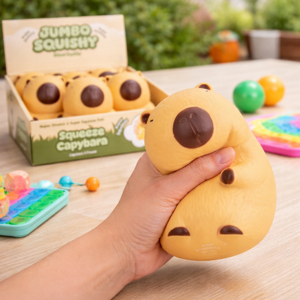 Mit dem Sombo Jumbo Squishy Capybara holst du dir einen besonders niedlichen Begleiter für entspannte Momente. Das grosse Capybara Knautsch Spielzeug lädt dich dazu ein, es zu drücken, zu kneten und einfach den Alltag hinter dir zu lassen. Ideal, um Stress abzubauen oder die Hände spielerisch zu beschäftigen.