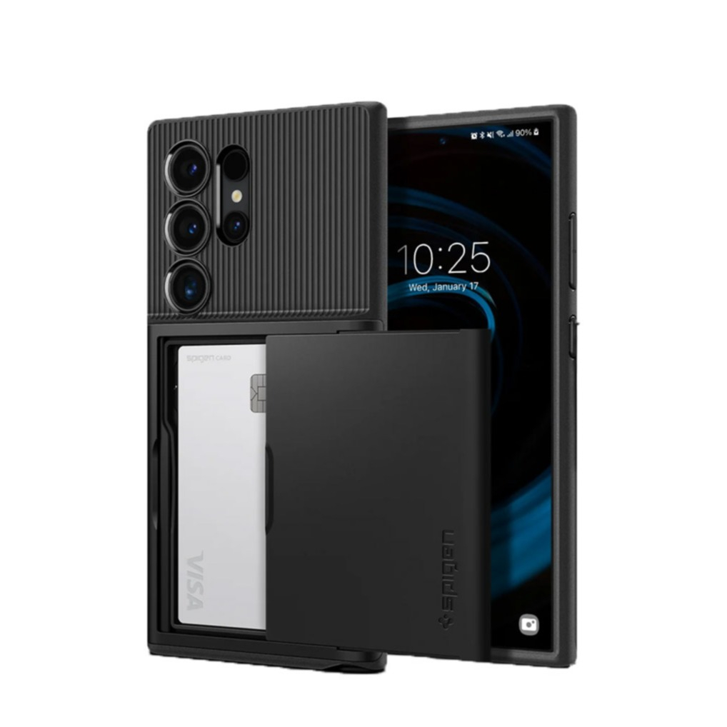 Perfekter Schutz mit Stil – für dein Samsung Galaxy S24 Ultra und Kreditkarte zugleich. Die Spigen Slim Armor CS Schutzhülle ist die clevere Kombination von Luftpolster-Technik an allen Ecken, dämpfendem TPU innen und hartem Polycarbonat aussen. Im integrierten Schiebefach ist deine Kreditkarte bestens aufgehoben und schnell zur Hand.