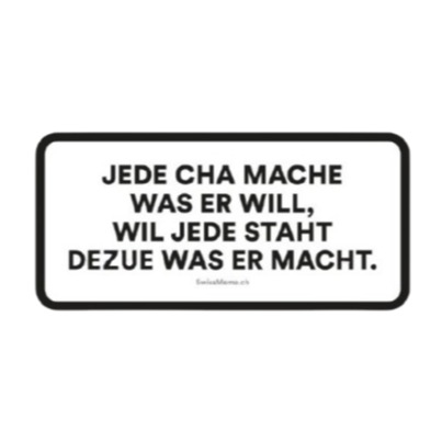 Mit diesem lustigen Sticker von SwissMeme setzt du ein humorvolles Statement! Der hochwertige Aufkleber mit dem Spruch „Jede cha mache was er will, wil jede staht dezue was er macht“ ist perfekt geeignet für auf Gegenstände wie dein Laptop, dem Auto oder am Spind und bringt garantiert ein Schmunzeln mit sich. Dank seiner wasserfesten Oberfläche hält der Meme Sticker auch draussen oder im Alltag zuverlässig. Perfekt für alle, die Memes lieben und gerne mit einem Augenzwinkern durchs Leben gehen.