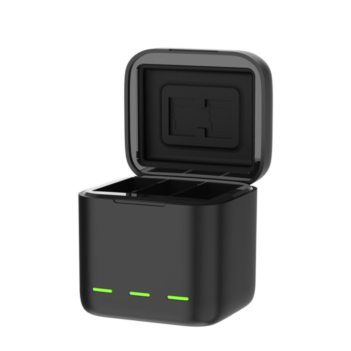 Mit diesem 3-fach Ladegerät kannst du drei GoPro Hero 9 Akkus zur selben und in kurzer Zeit aufladen. Das kompakte Design und das leichte Gewicht machen es möglich, die dreifache Akku-Box überall hin mitzunehmen.