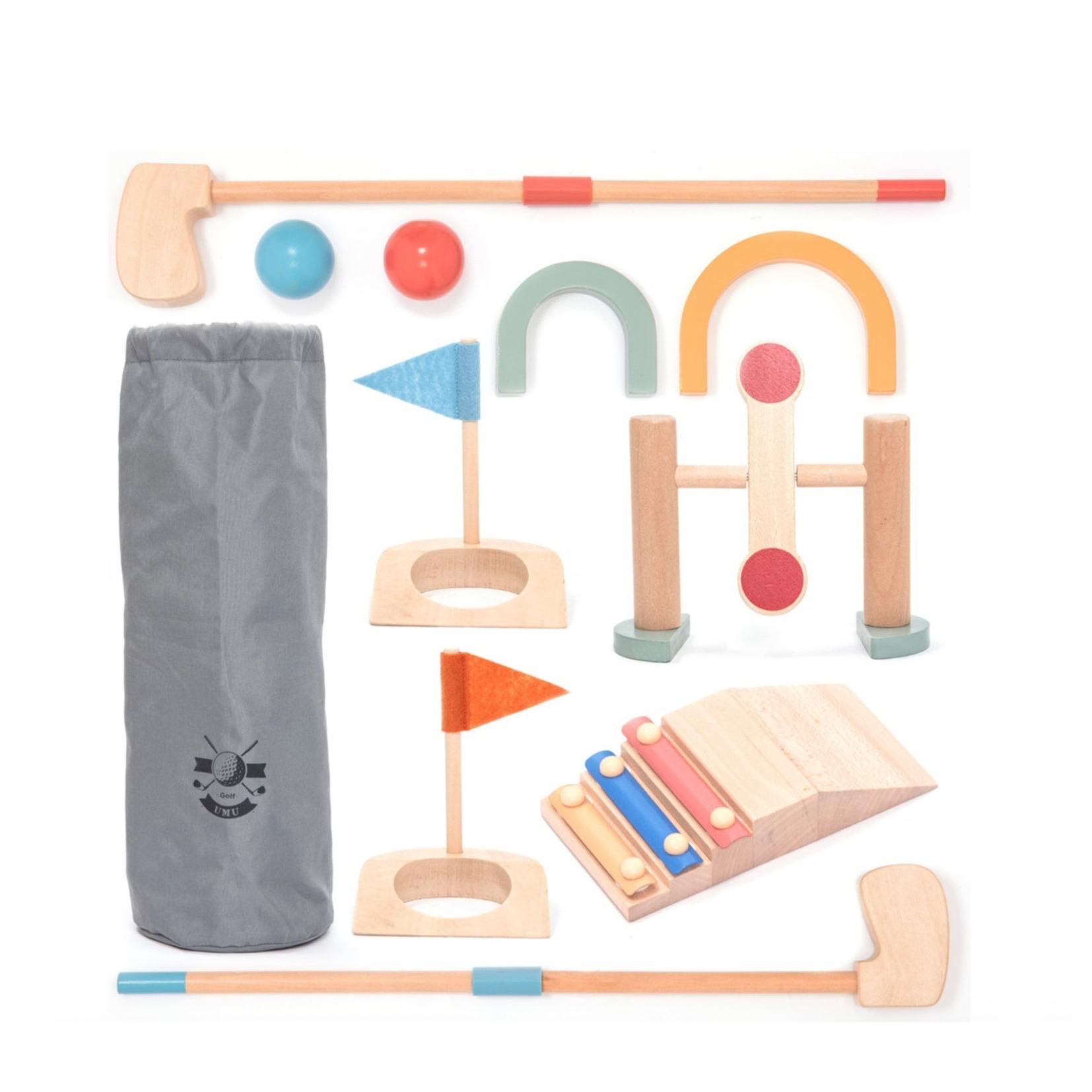 Das UMU Minigolf Spielset aus Holz bringt Kindern spielerisch die Welt des Minigolfs näher. Mit 11 liebevoll gestalteten Teilen bietet das Set alles, was kleine Minigolfer brauchen, um drinnen und draussen Spass zu haben. Das robuste Holzmaterial ist sicher und langlebig, perfekt für kleine Kinder Hände. Dieses Spielset fördert spielerisch die Feinmotorik, Hand Augen Koordination und das Verständnis für Spielregeln und Zielgenauigkeit. Ob im Garten, auf dem Balkon oder im Kinderzimmer, mit dem UMU Minigolf Set erleben Kinder spannende Momente voller Bewegung und Lernen.