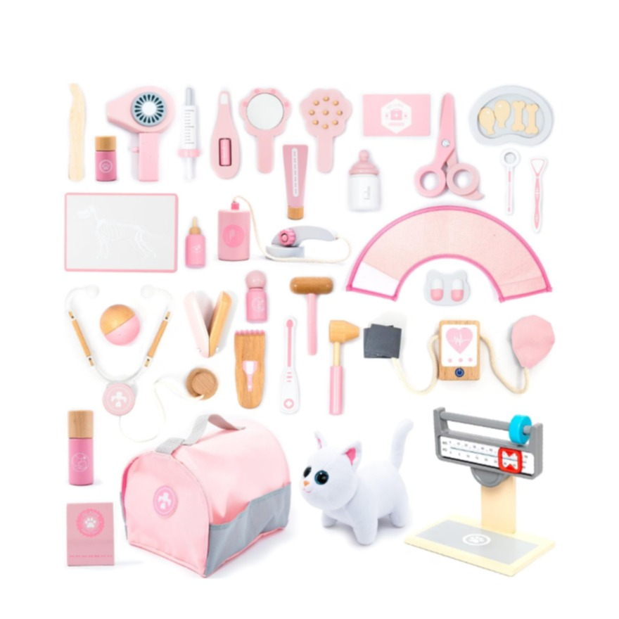 (37-tlg. Set) Holz Kinder Tierarzt Spielzeug Doktor Zubehör Lern Spielset (UM012) - Rosa
