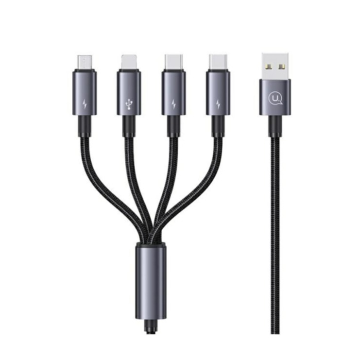 Mit unserem praktischen 4in1 Ladekabel von Usams kannst du ab nun deine Smartphones und Tablets problemlos über USB A aufladen. Das Ladekabel verfügt über einen Lightning, einen Micro USB und zwei USB C Anschlüsse. Dadurch ist es vielseitig einsetzbar und der ideale Begleiter auch für unterwegs oder auf Reisen. Das hochwertige und sehr stabile Kabel von Usams macht ein Verknoten fast unmöglich und ist jederzeit sofort einsatzbereit.
