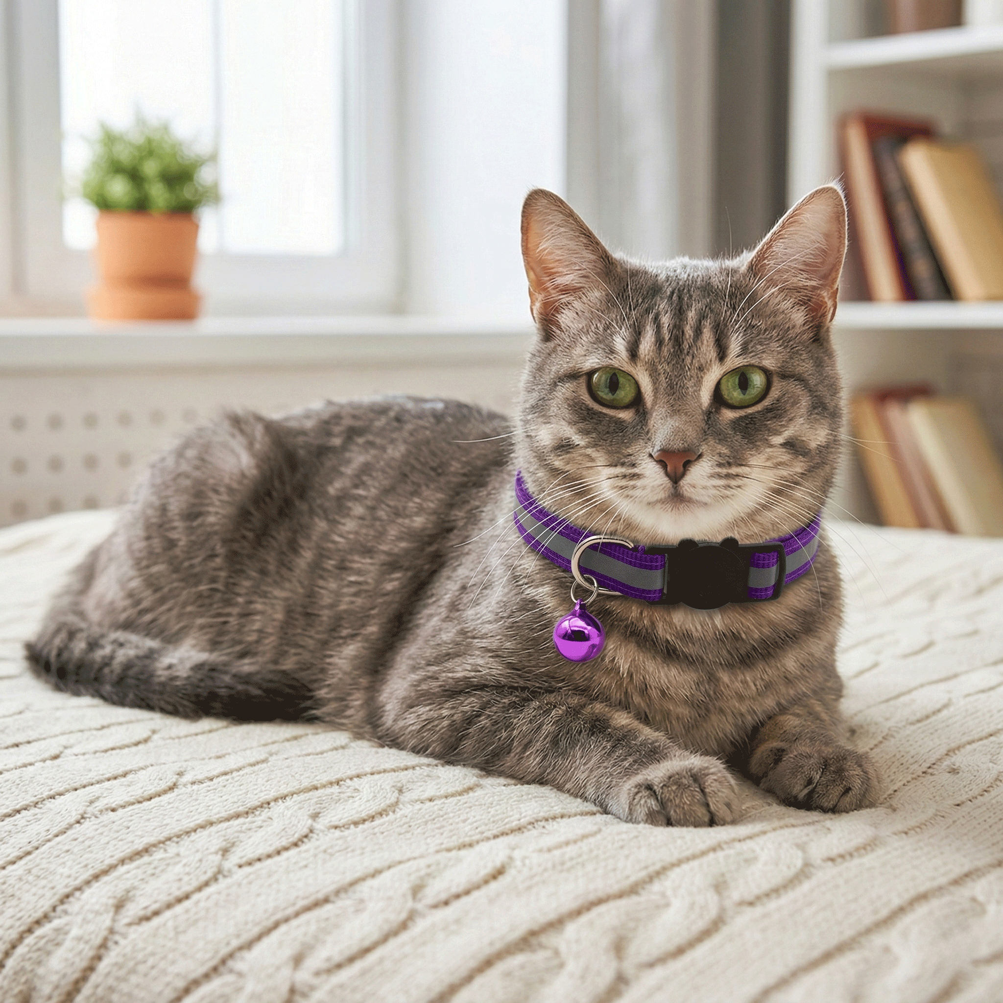 Verstellbares Katzen Halsband mit Reflektor Streifen + Glöckchen - Violett